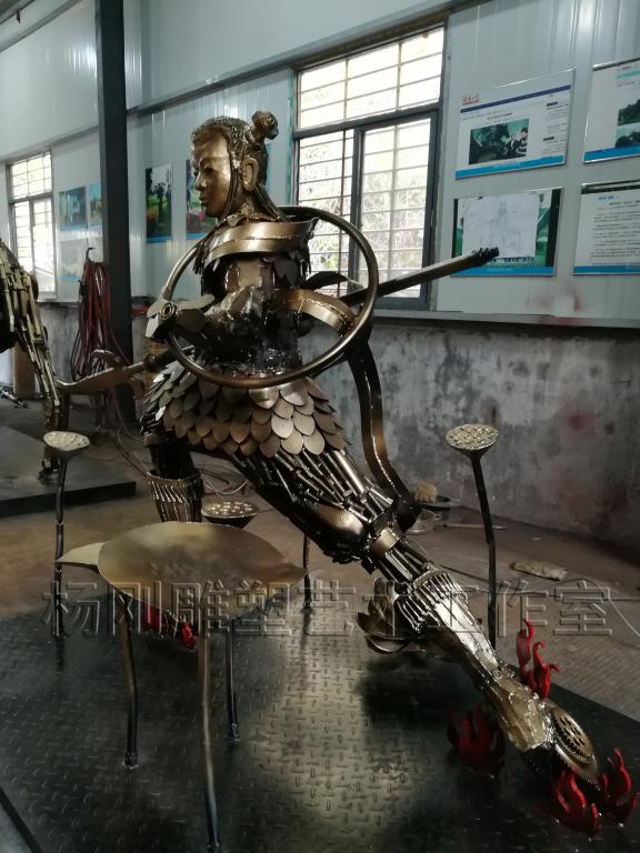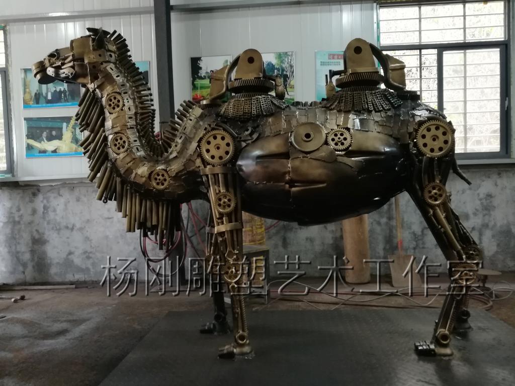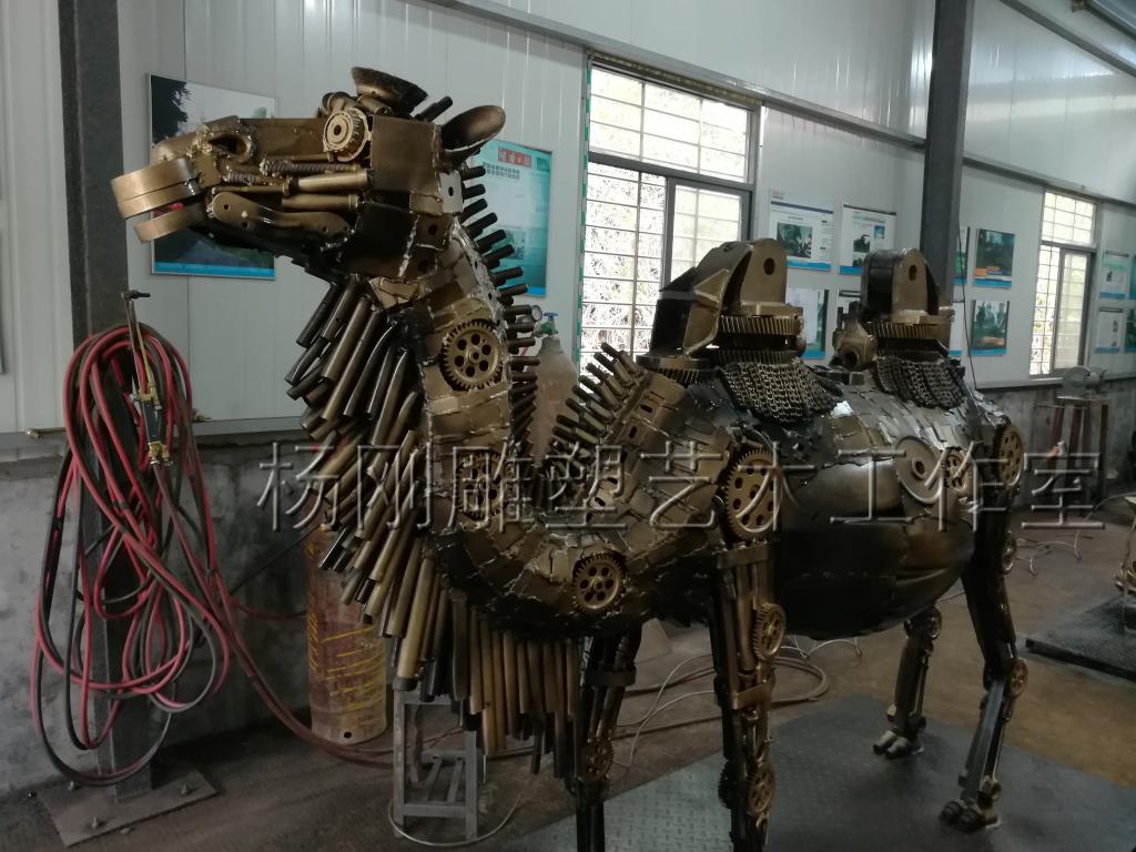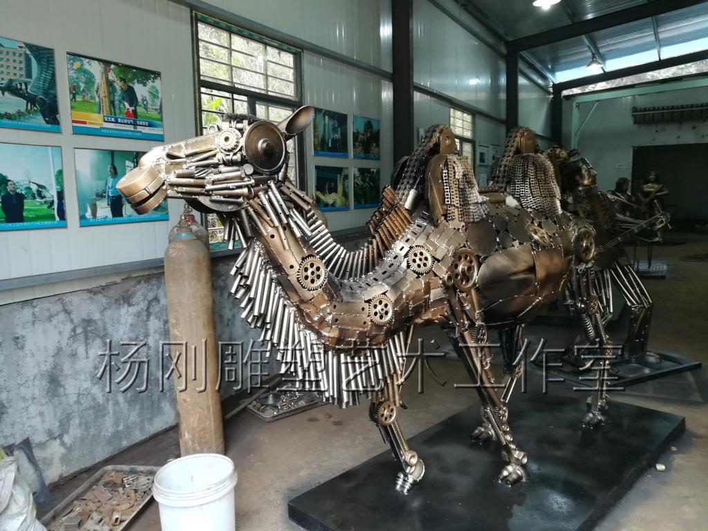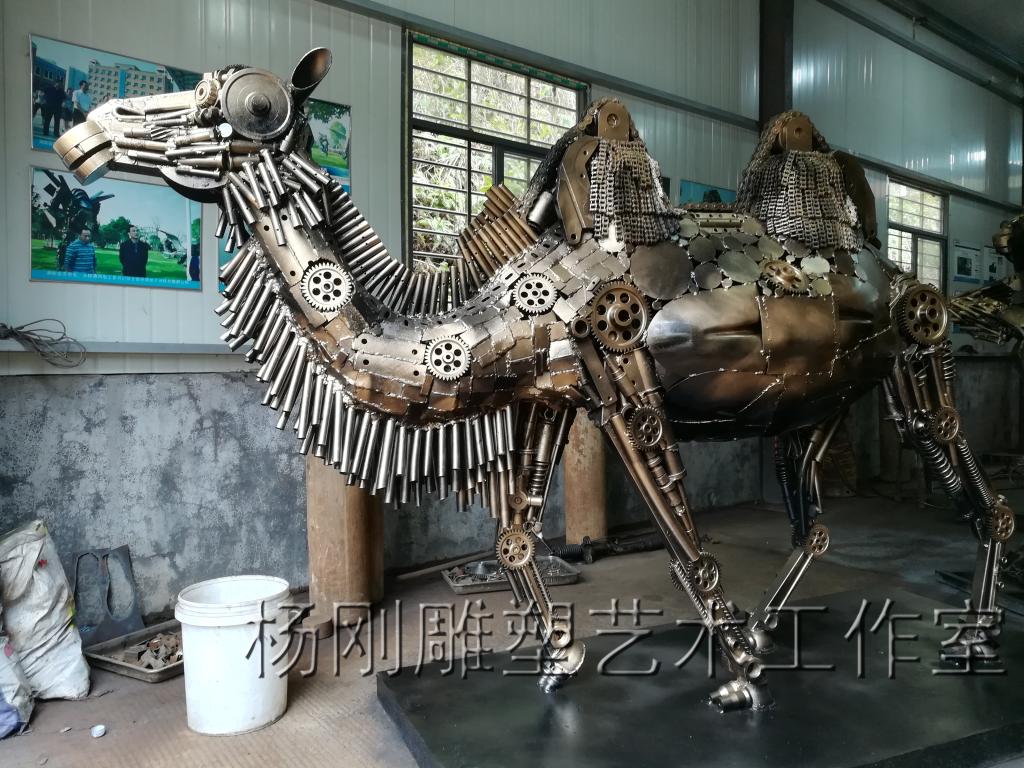 2017年3月,经过近3个月的创作,杨刚老师完成了六件雕塑新作,作品分别是《少年哪吒》、《黄河鲤鱼》、《回族少女》、《回族弹奏老人》、《行走骆驼》、《静立的骆驼》,这批作品构思独特、制作精美,杨刚老师将独特的民族艺术风情和元素完美融于现代钢铁雕塑艺术中,实属不易。这批作品已经于2017年3月24日运抵甘肃兰州,安置在兰州华宜再生资源展览馆,至此湖南涉外经济学院杨刚工作室为高原再添新景。